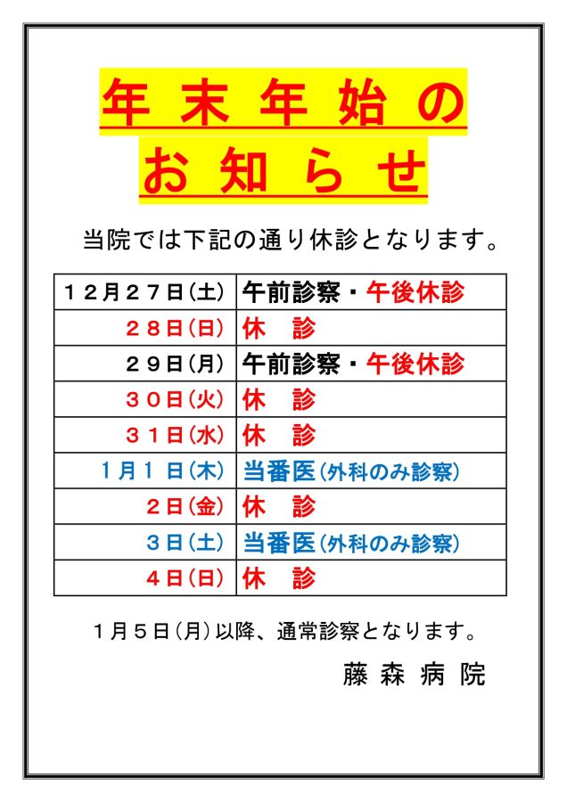 令和7年度 年末年始休診日のお知らせ